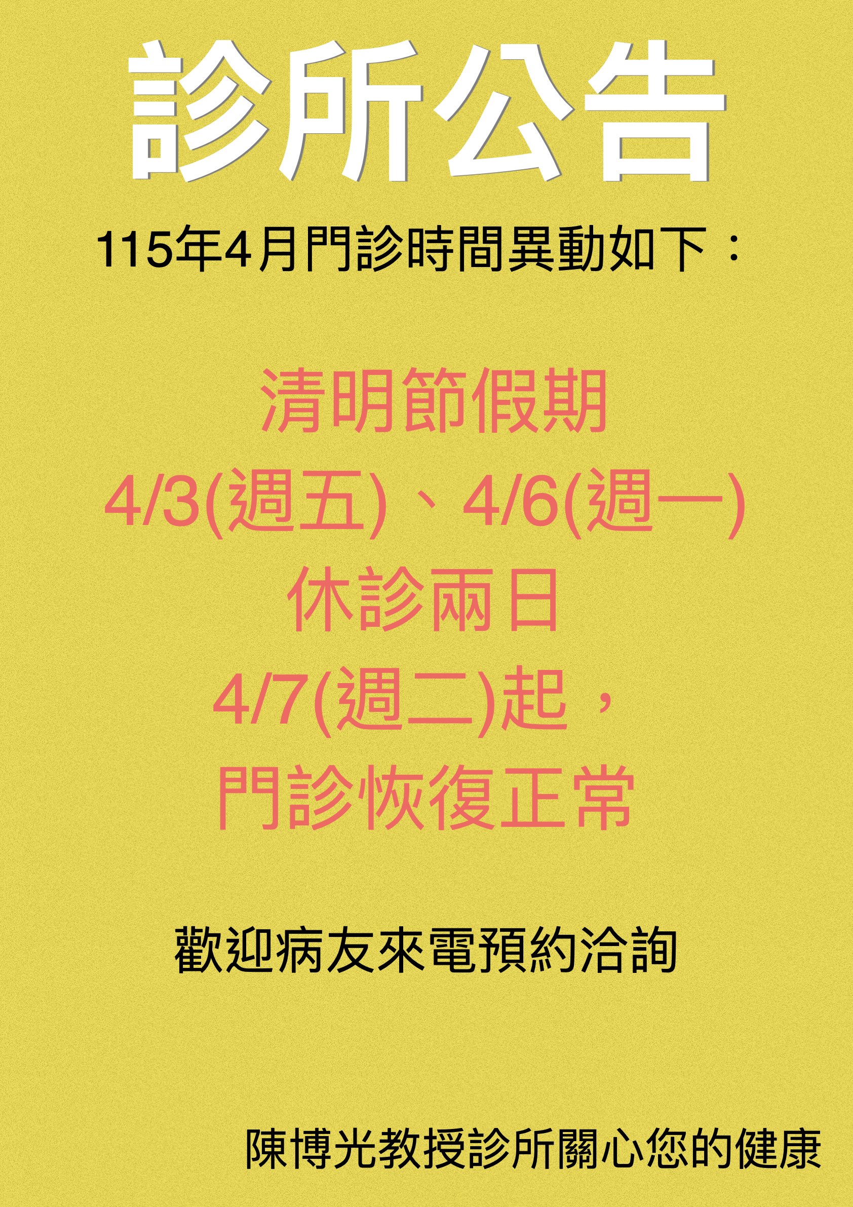 4月門診時間異動公告